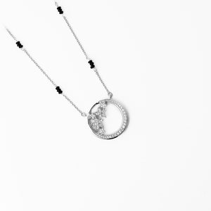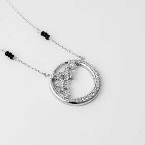Crafted from 92.5% sterling silver, this minimal mangalsutra features a circular rim adorned with sparkling zircon stones in a pavé setting. Within the circle, a cluster of zircon floral motifs creates a delicate, radiant centerpiece. Black beads are strung throughout the necklace, adding a classic touch while complementing the contemporary elegance of the design.
