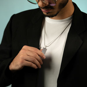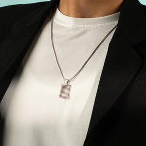 This rectangle pendant is expertly crafted from 92.5 sterling silver, featuring a distinctive circular texture across its surface. The oxidized finish adds a unique depth and character to the piece, giving it a bold, vintage-inspired look. The combination of the sleek rectangular shape, textured detail, and darkened tones creates an accessory that exudes sophistication and modern edge. Perfect for adding an intriguing touch to both casual and formal outfits, this pendant is a statement piece that stands out with its understated elegance.